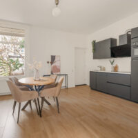 Centraal in de woning bevindt zich de woonkeuken, die mooi in verbinding staat met zowel de woonkamer als de slaapkamer aan de achterzijde. De ruimtes worden van elkaar gescheiden door stijlvolle en-suite deuren met glas-in-lood, wat zorgt voor extra karakter en flexibiliteit in het gebruik van de ruimtes. De keuken is modern uitgevoerd en voorzien van diverse inbouwapparatuur. Dankzij de doorzonindeling stroomt het daglicht prettig door de hele woning.