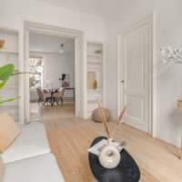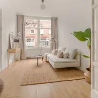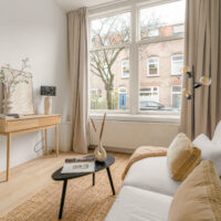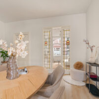 Bij binnenkomst valt direct het prettige licht en de ruimtelijke sfeer op. De woonkamer aan de voorzijde kijkt uit op de rustige straat en biedt volop ruimte voor een comfortabele zithoek en een eettafel. De hoge plafonds en grote raampartijen versterken het open karakter van de ruimte en zorgen voor een aangename leefomgeving.