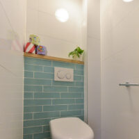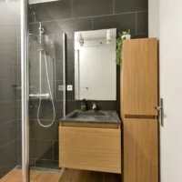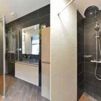 De badkamer is stijlvol en compact, met een moderne douche, wastafelmeubel en toilet. Alles netjes afgewerkt, zodat je er direct in kan.