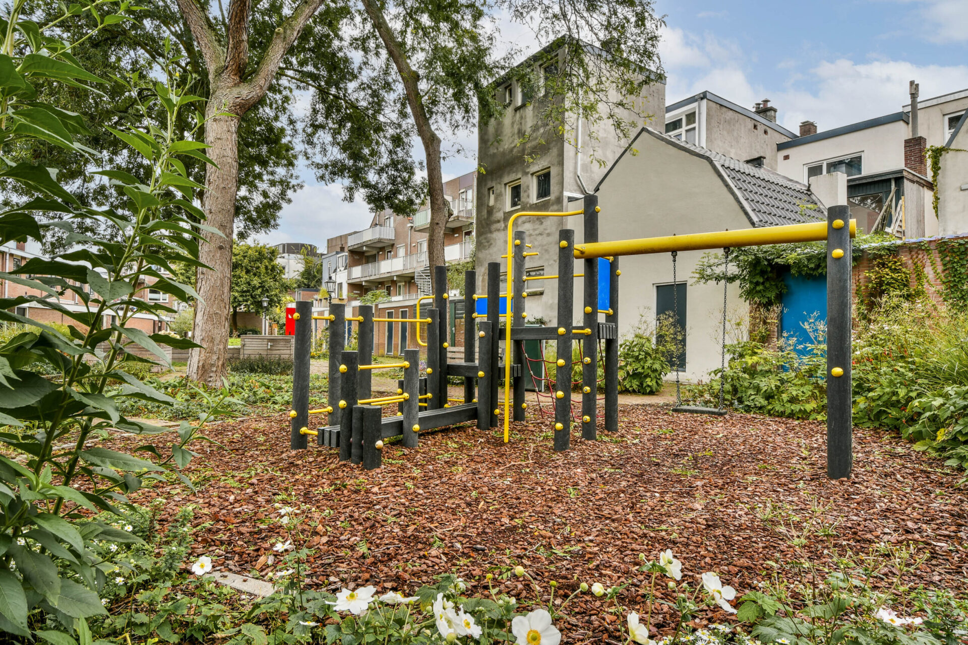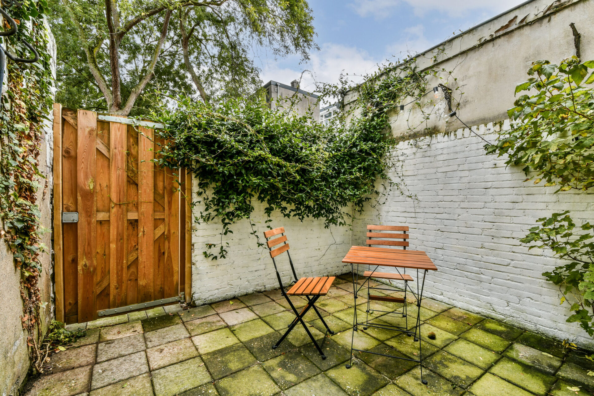 • Een achtertuin met achterom, grenzend aan een besloten hofje;