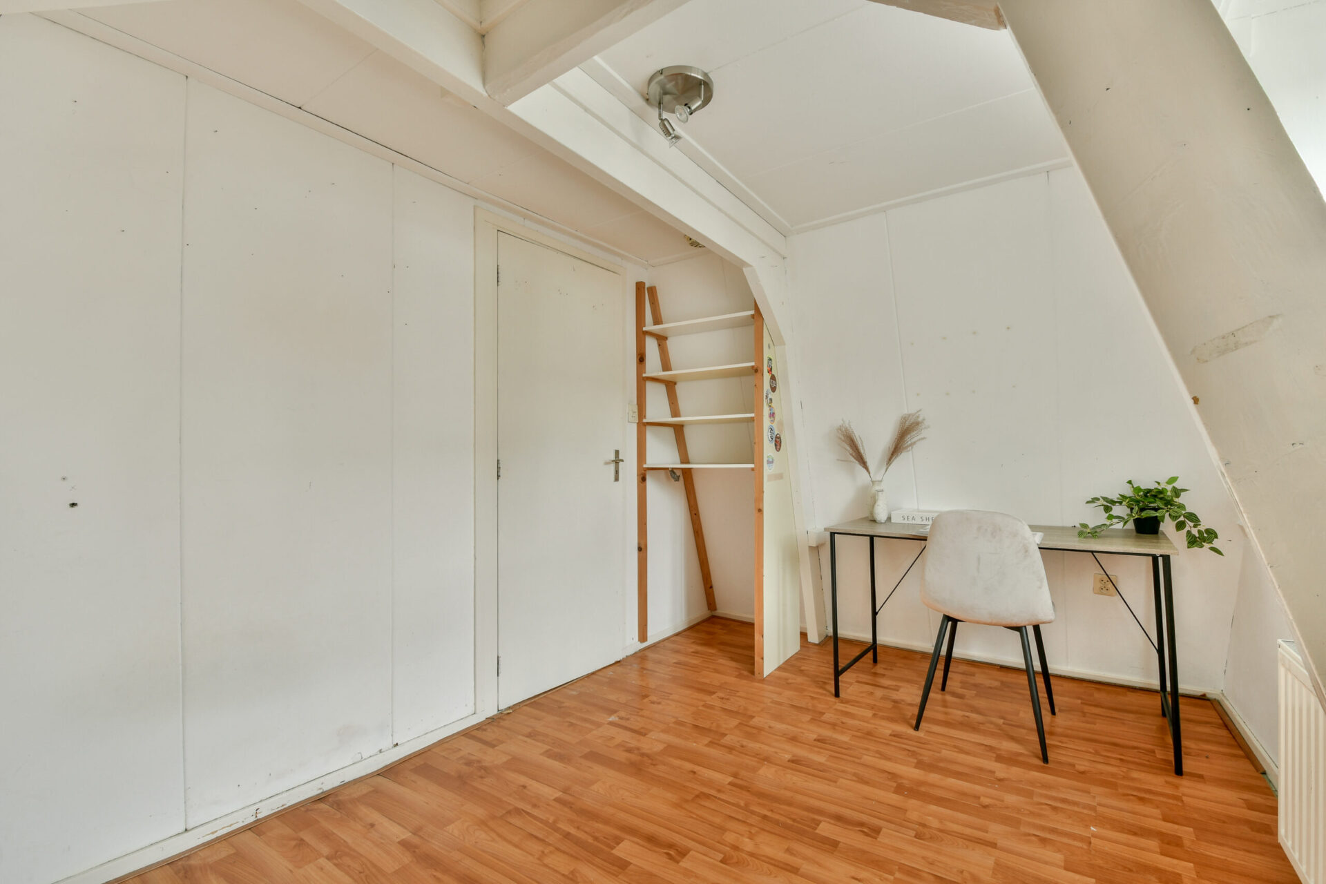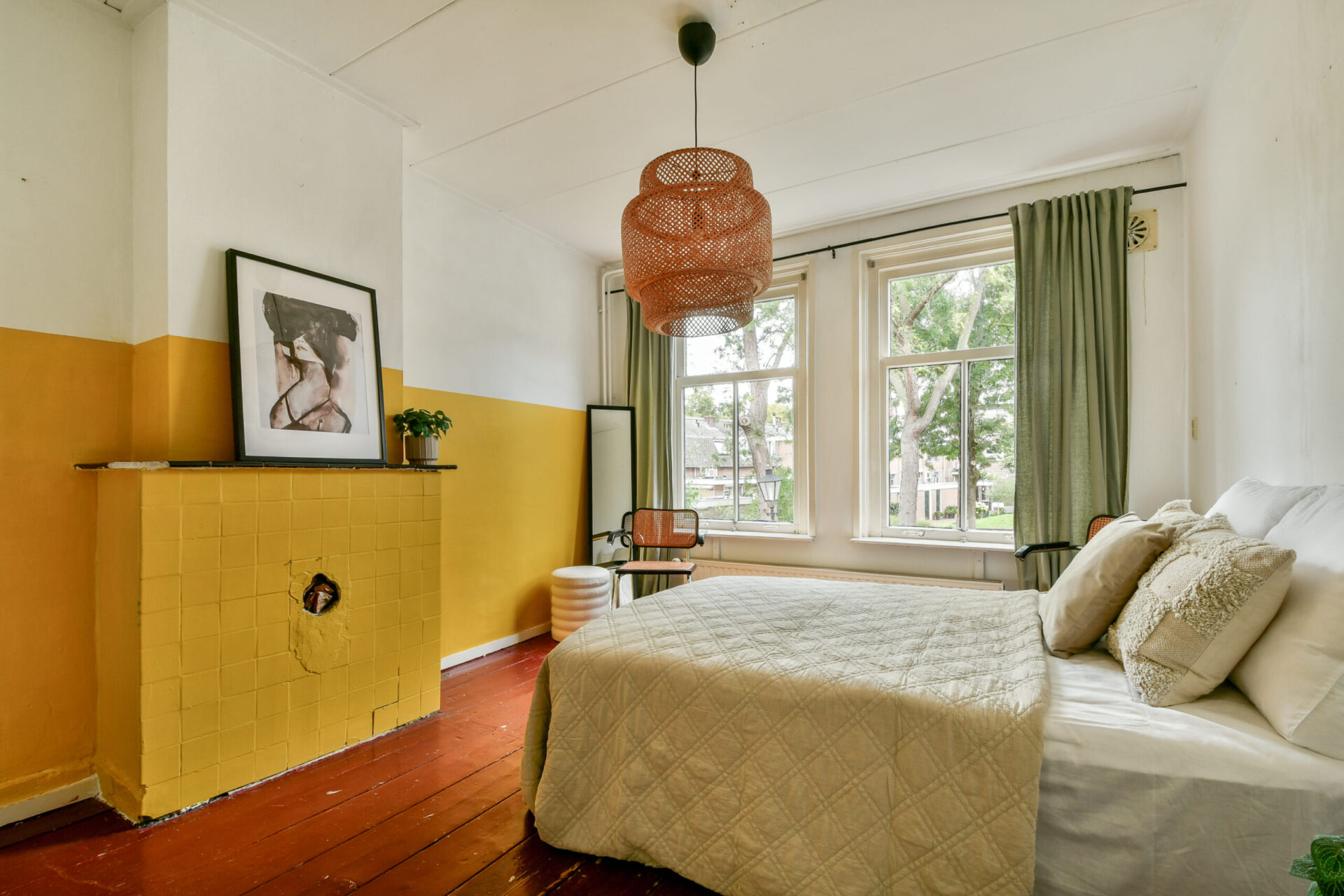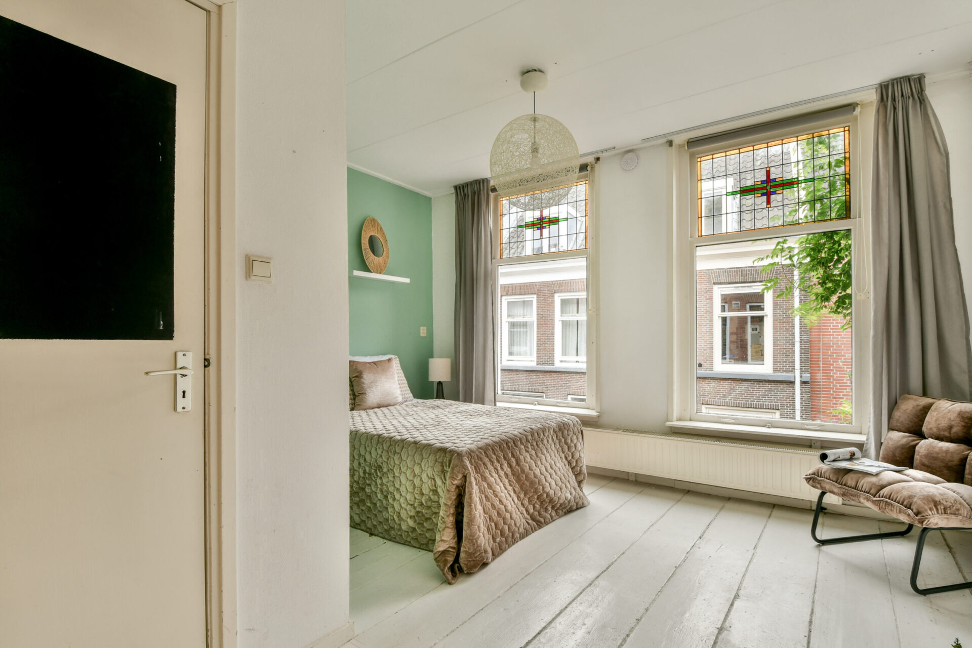 De eerste verdieping heeft aan de voorzijde een sfeervolle kamer met glas-in-loodramen, een plek die bijna vraagt om als werkkamer of atelier gebruikt te worden. Aan de achterzijde ligt een ruime slaapkamer met aangrenzende walk-in, die ook kan worden ingericht als inloopkast of extra werkhoek. Op deze verdieping bevindt zich ook het toilet.
