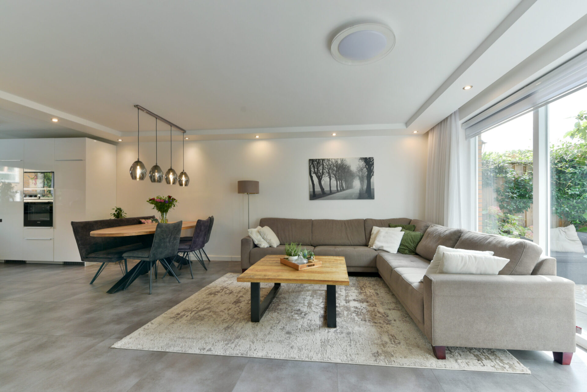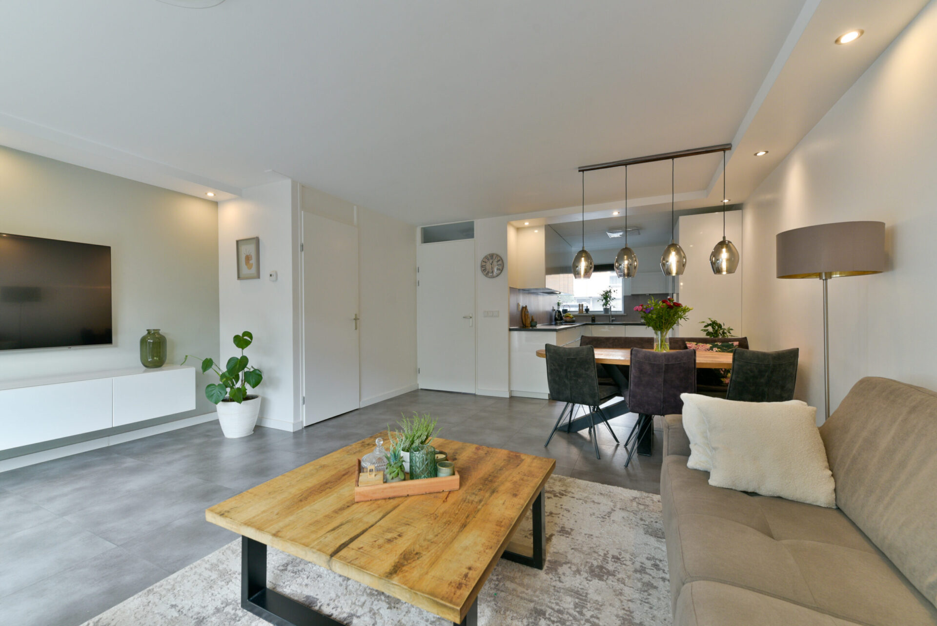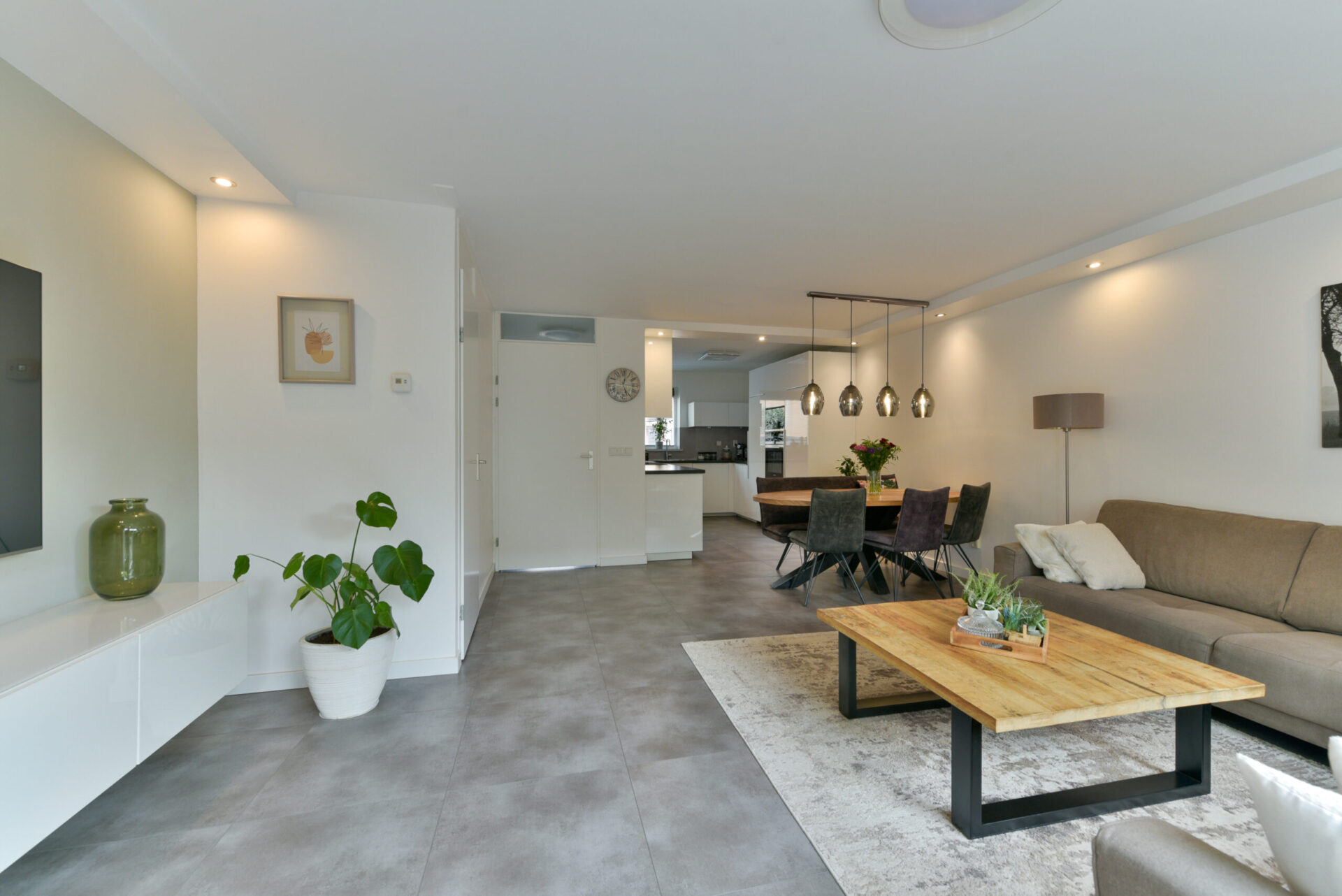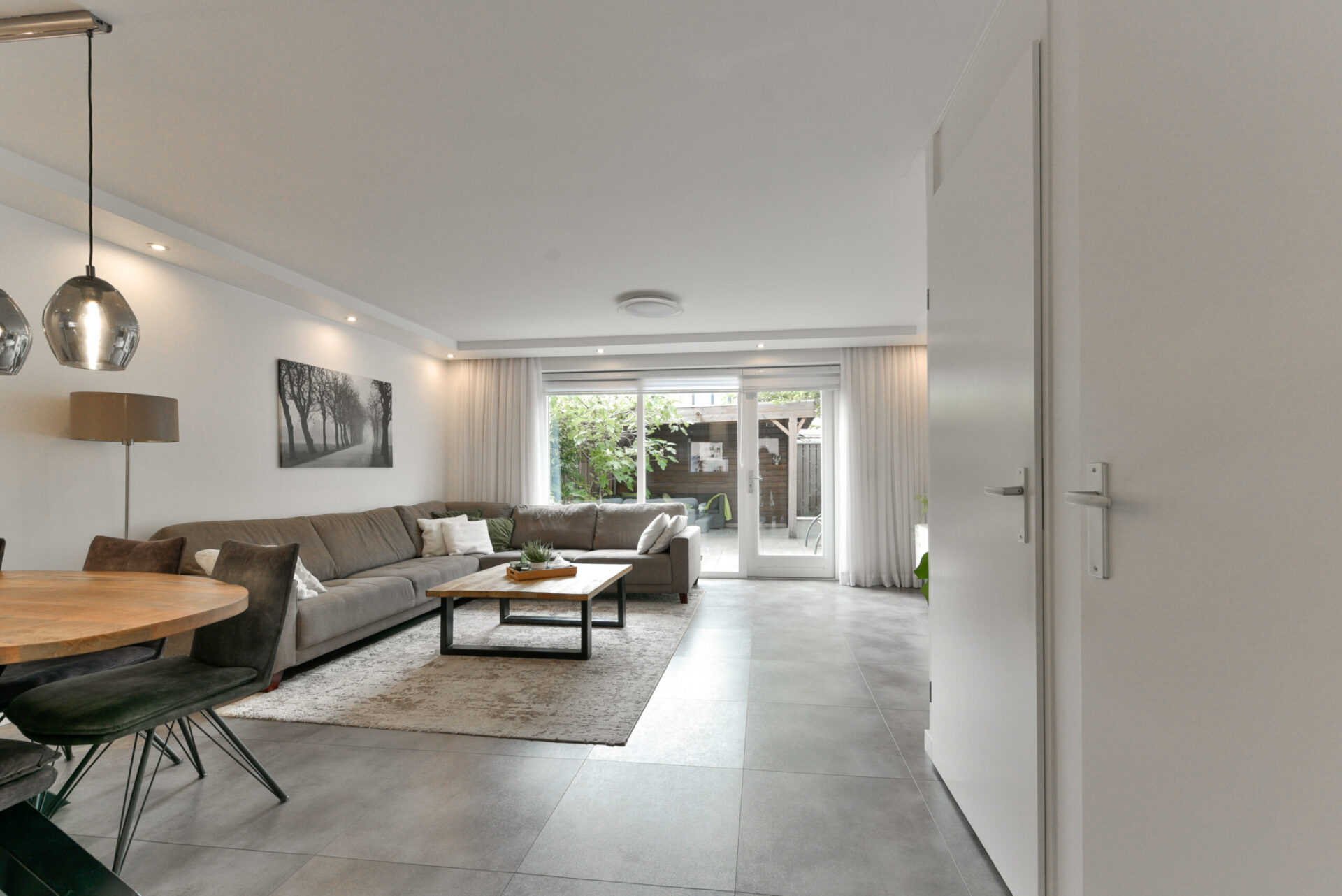 Bij binnenkomst valt meteen de ruimte en het licht op. De woonkamer is prettig ingedeeld en dankzij de deur naar de tuin komt er veel daglicht binnen. De moderne keuken aan de voorzijde is van alle gemakken voorzien en sluit mooi aan op de eigentijdse uitstraling van de woning.