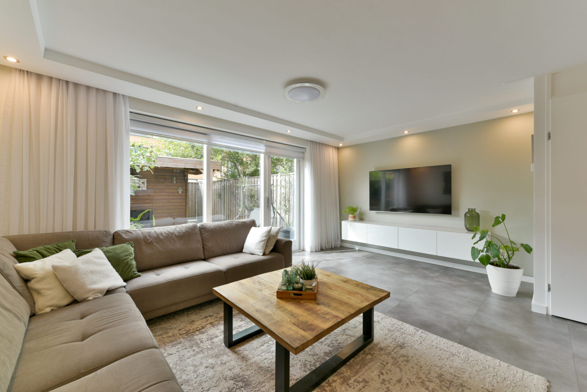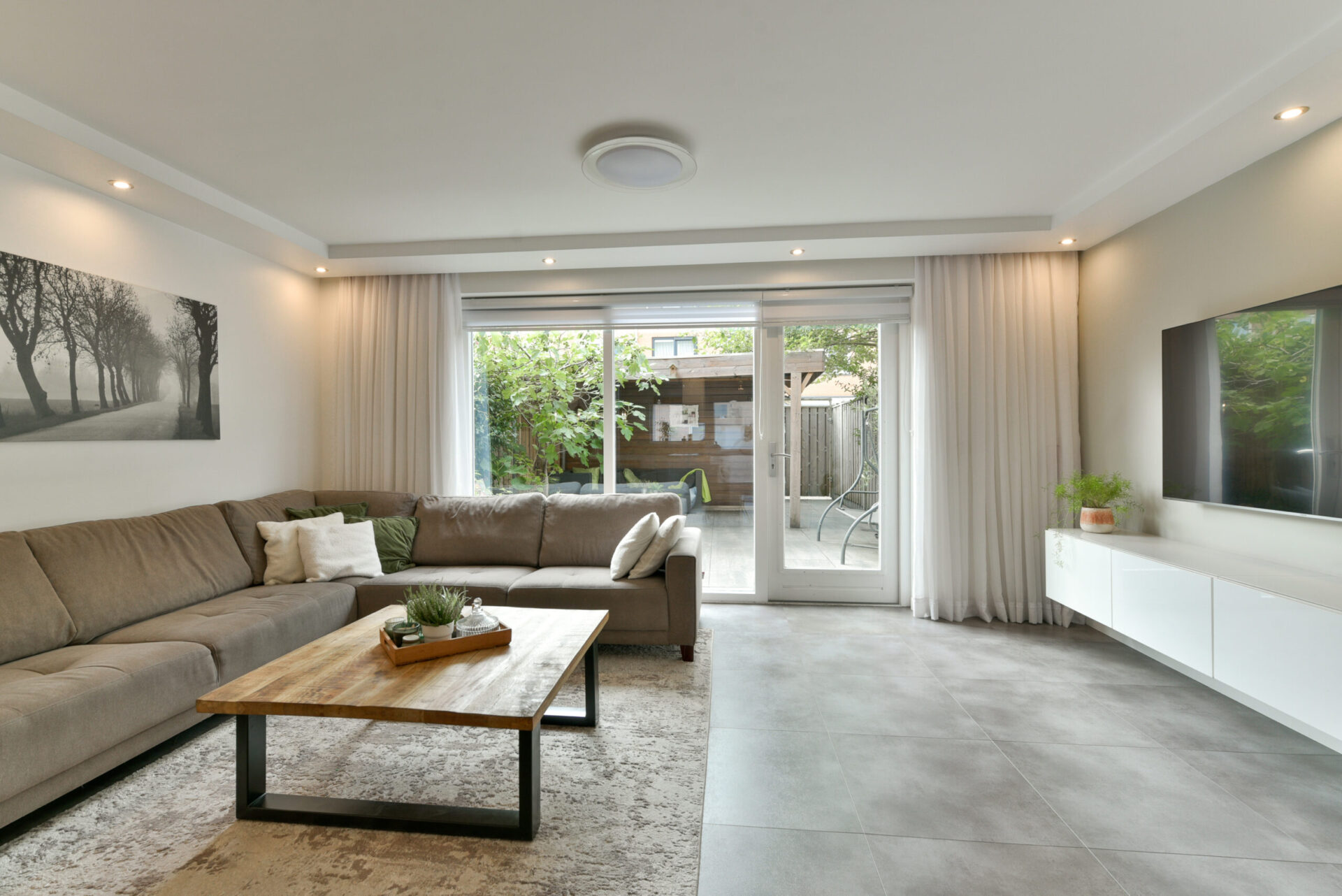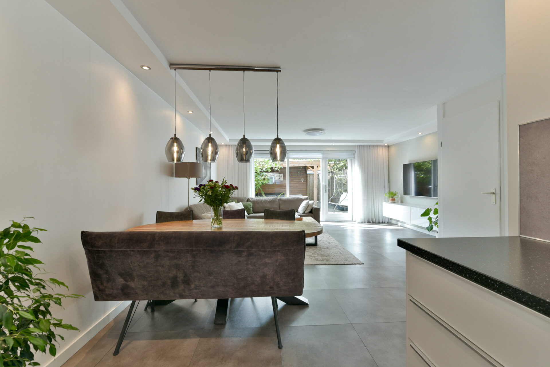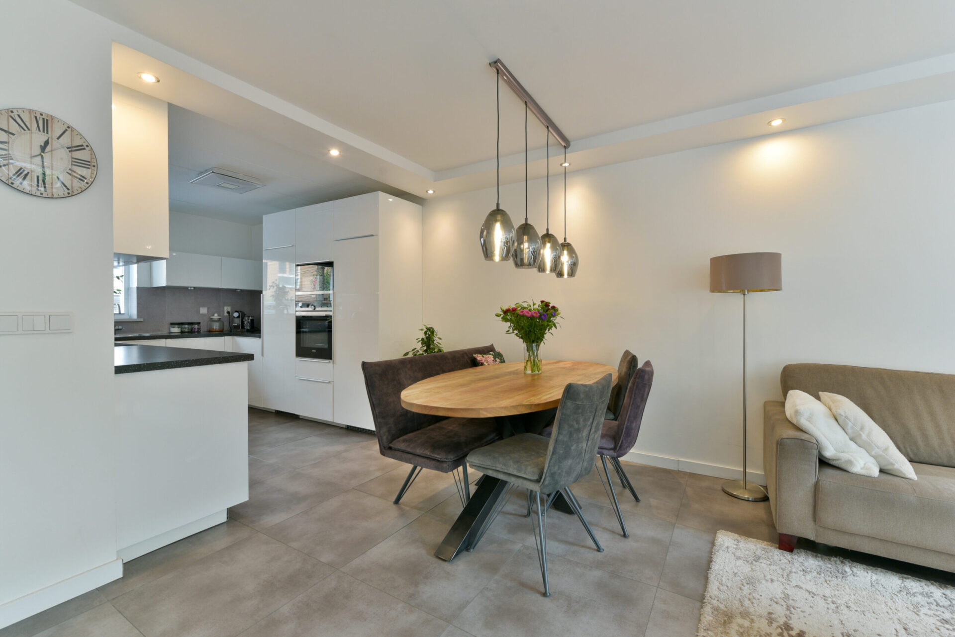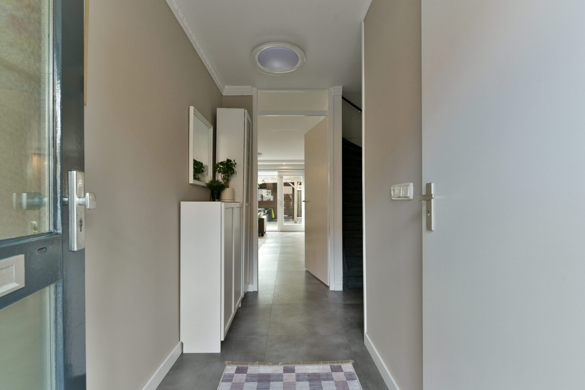 Bij binnenkomst valt meteen de ruimte en het licht op. De woonkamer is prettig ingedeeld en dankzij de deur naar de tuin komt er veel daglicht binnen. De moderne keuken aan de voorzijde is van alle gemakken voorzien en sluit mooi aan op de eigentijdse uitstraling van de woning.