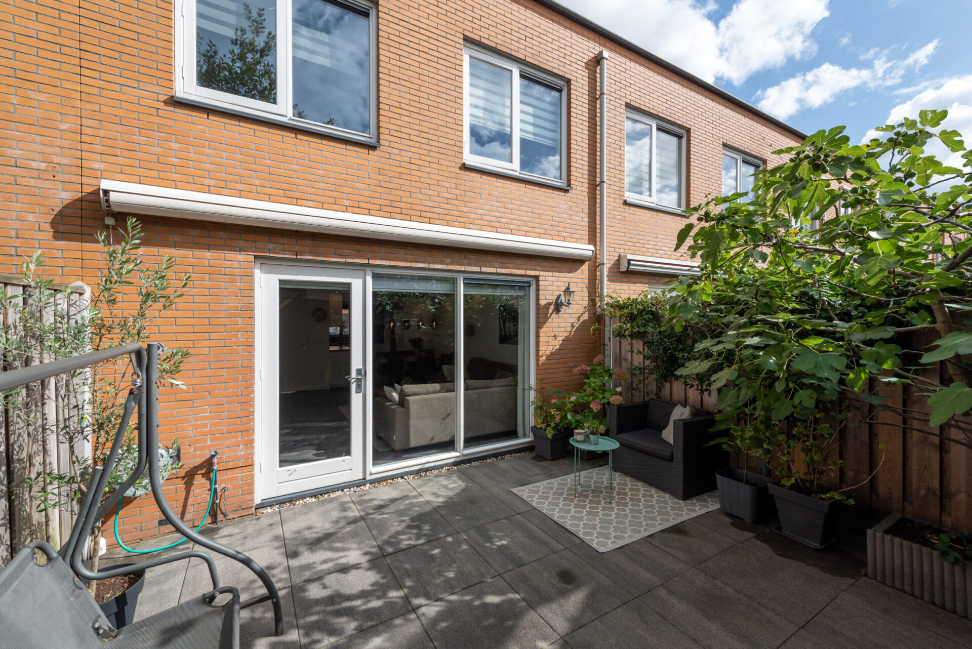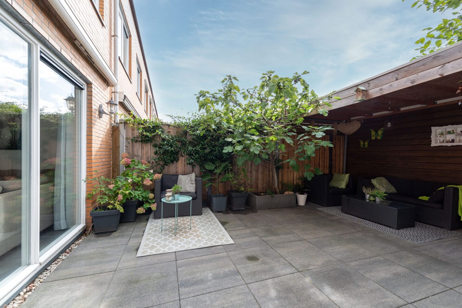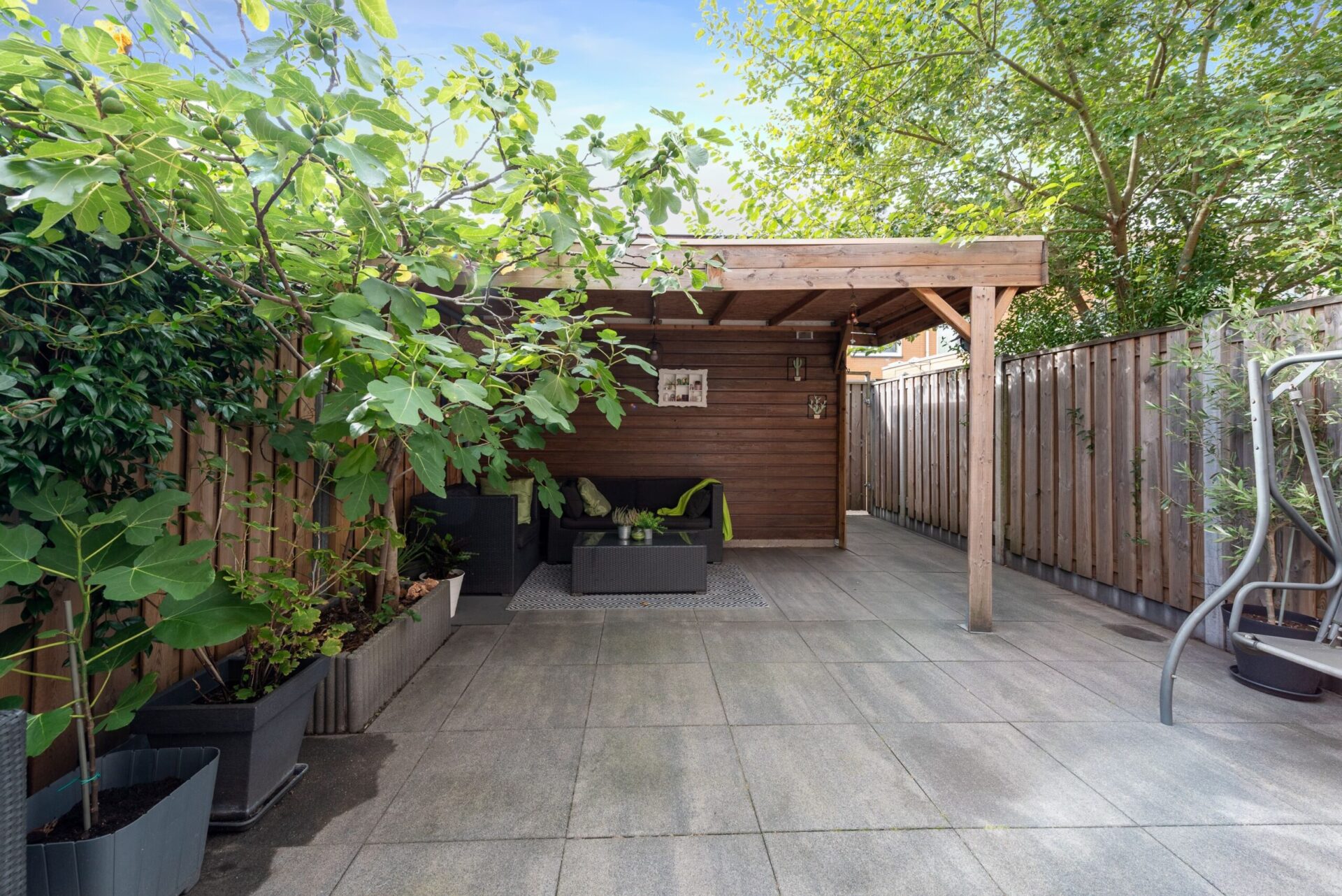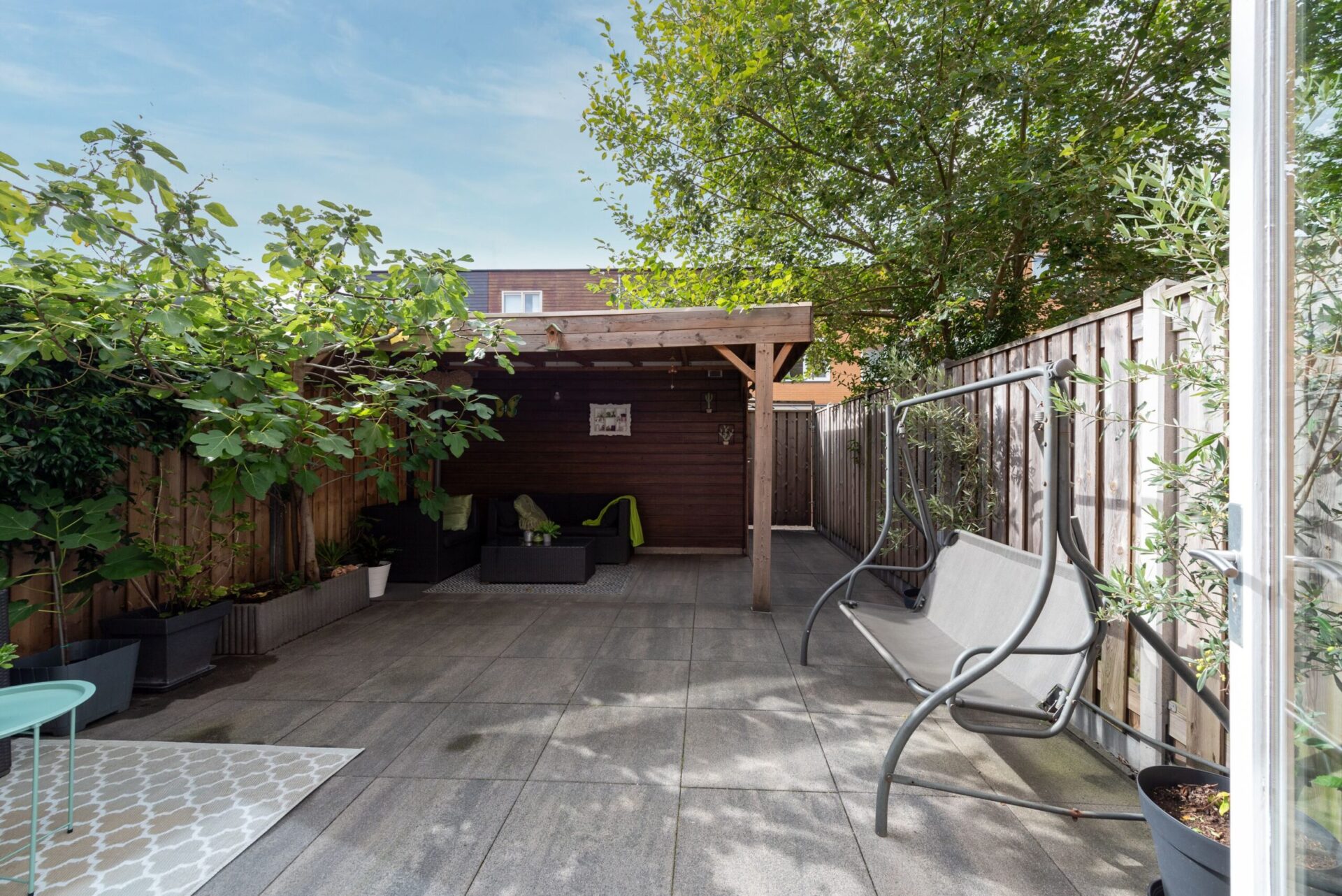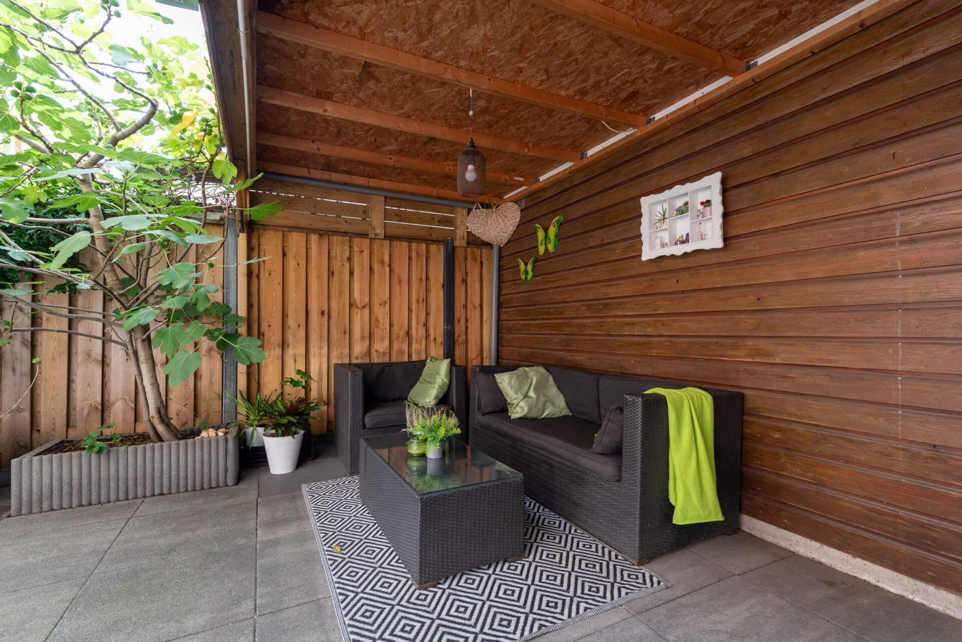 De achtertuin ligt op het zuidwesten waardoor je hier de hele dag door van de zon kunt genieten. Achterin staat een berging met overkapping. Een praktische én gezellige plek om fietsen en tuinspullen neer te zetten of om een loungehoek te creëren.