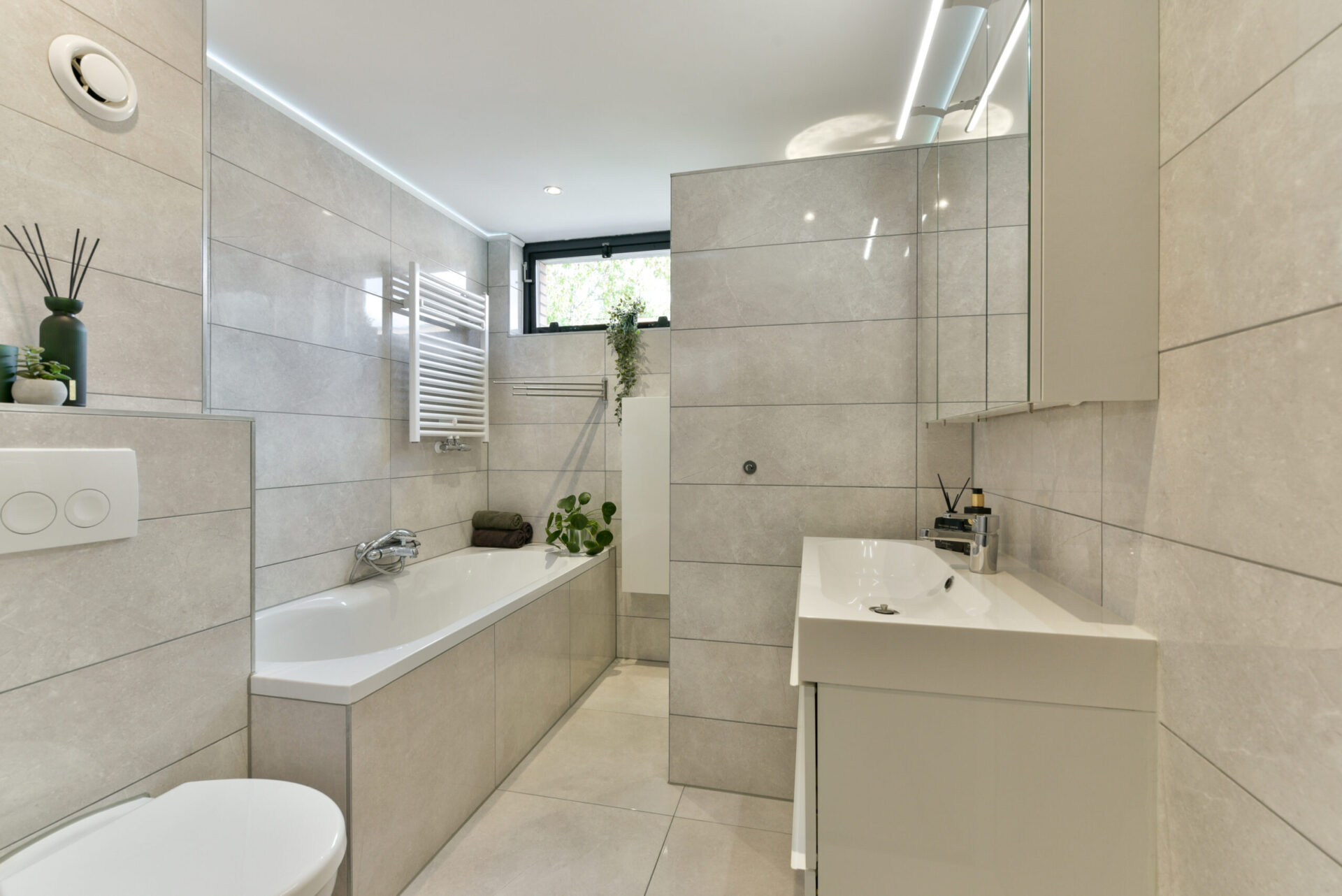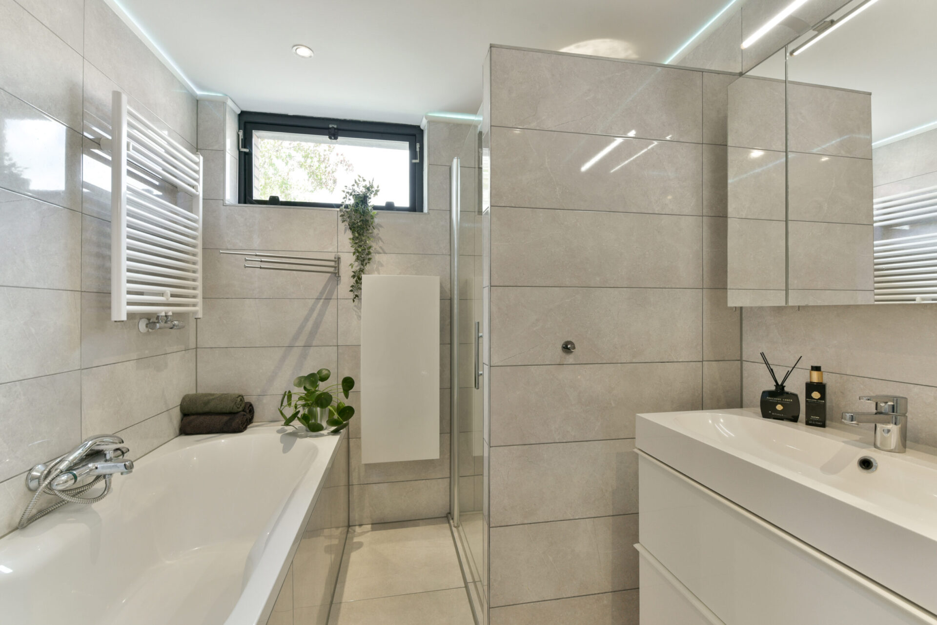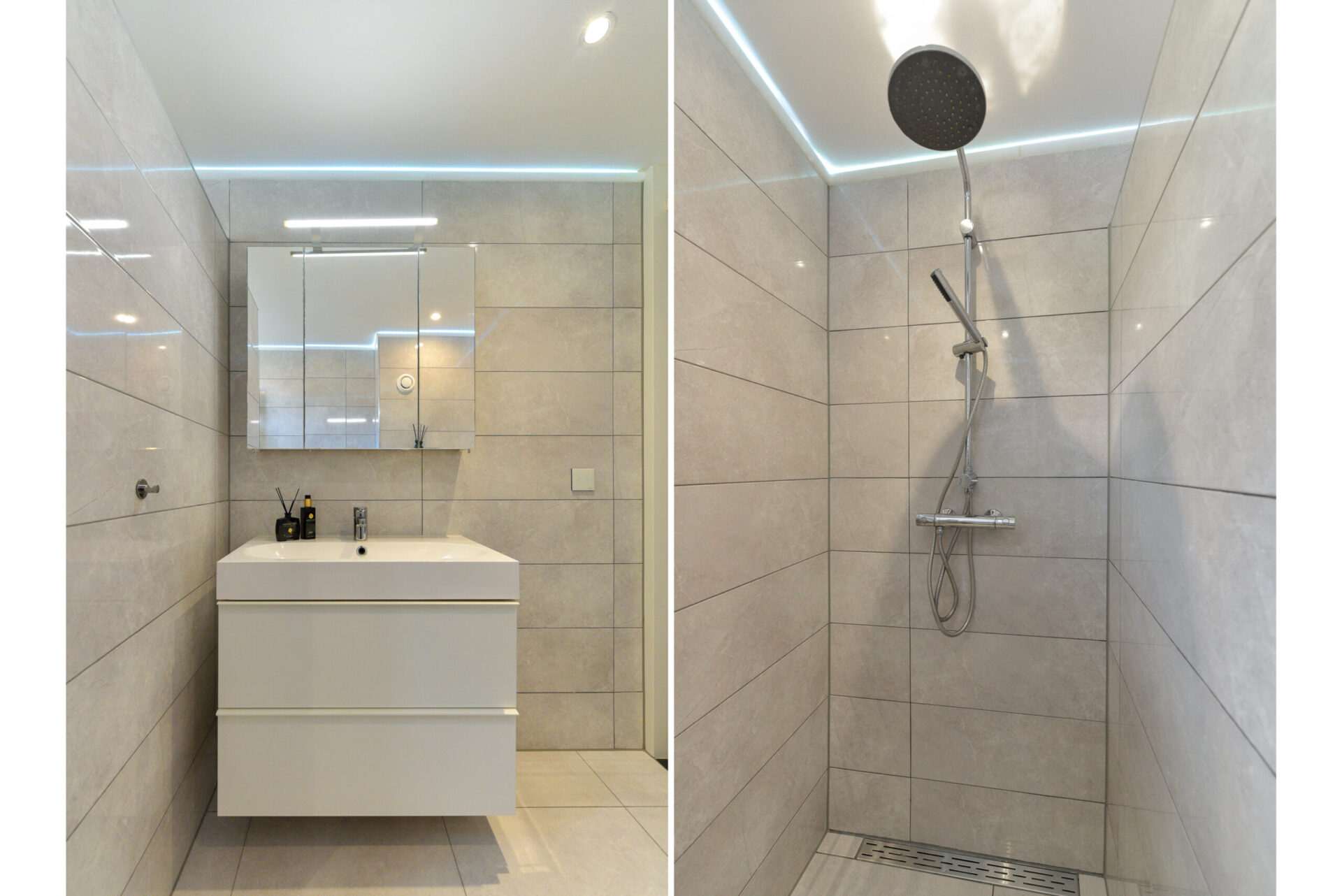 - Badkamer voorzieningen Toilet, dubbele wastafel, wastafelmeubel, inloopdouche