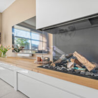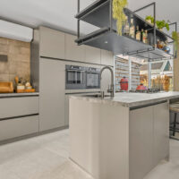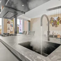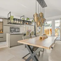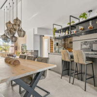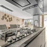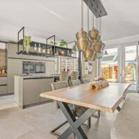 Aan de achterzijde bevindt zich de open keuken, voorzien van een luxe kookeiland met vierpits gaskookplaat, hoge druk wokbrander, geïntegreerde wasemkap, Quooker, combi stoomoven, combi magnetron, warmhoudlade en vaatwasser. Dimbare verlichting, grote lades, een gezellige eetbar en het stootvaste TopCore werkblad maken de keuken compleet.