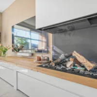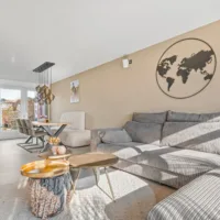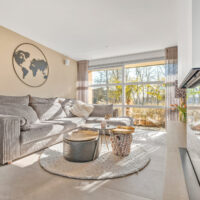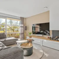 De begane grond is in 2021 grotendeels vernieuwd. De woonkamer is modern en sfeervol, met een op maat gemaakt meubel voorzien van een Dru gesloten gashaard die eenvoudig via een app te bedienen is. Brede berglades bieden extra opbergruimte en het kamerhoge raam zorgt voor veel daglicht.