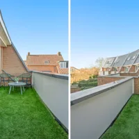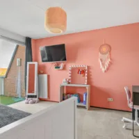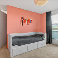 Op de eerste verdieping geeft de overloop toegang tot drie ruime slaapkamers en de badkamer. De slaapkamer aan de voorzijde biedt ruimte voor een groot tweepersoonsbed en een garderobekast. De twee slaapkamers aan de achterzijde hebben toegang tot het balkon en zijn voorzien van kamerhoge ramen voor veel daglicht.