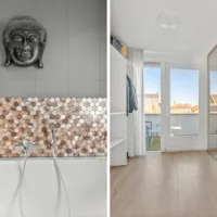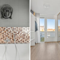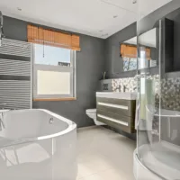 De moderne badkamer is uitgerust met ligbad, douche, wastafel met spiegelkast, toilet, handdoekradiator en vloerverwarming. Het raam zorgt voor natuurlijke ventilatie en extra lichtinval.