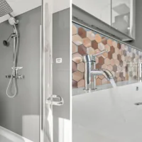 - Badkamer voorzieningen Ligbad, toilet, douche, dubbele wastafel