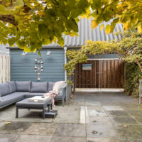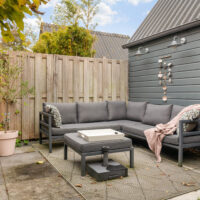 De brede, zonnige achtertuin biedt volop privacy en ruimte om te ontspannen of gezellig buiten te eten. Achterin de tuin staat een houten berging met elektra en er is een eigen parkeerplaats met laadpaal, direct grenzend aan de tuin.