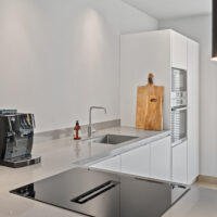 Aan de voorzijde bevindt zich de moderne open keuken, uitgerust met diverse inbouwapparatuur, waaronder een inductiekookplaat met geïntegreerde afzuiging, oven, magnetron, vaatwasser en koelkast.