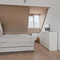 Overloop met toegang tot twee slaapkamers aan de achterzijde, beide voorzien van een dakkapel. De badkamer beschikt over een douche, dubbele wastafel en een tweede toilet. De derde slaapkamer aan de voorzijde is ruim van formaat.