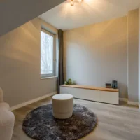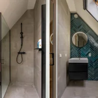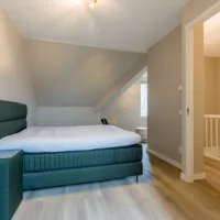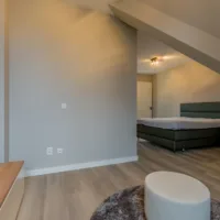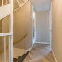 Tweede verdieping: overloop en grote zolderruimte. Deze kamer is met betrekking tot lichtpunten en schakelaars al voorbereid om er eventueel eenvoudig twee kamers van te maken. Tweede luxe badkamer met inloopdouche en wastafelmeubel. Technische ruimte met aansluiting voor de wasmachine en droger, warmtepomp en (vergrote) boileropstelling. De vliering is bereikbaar via een vlizotrap.