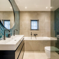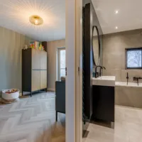 - Badkamer voorzieningen Ligbad, toilet, dubbele wastafel, wastafelmeubel, vloerverwarming, wastafelmeubel, inloopdouche, vloerverwarming