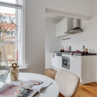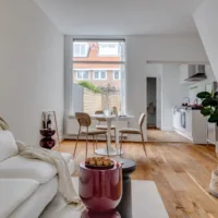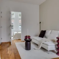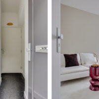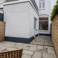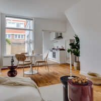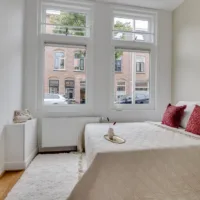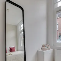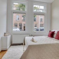 Je komt binnen via de entree die toegang geeft tot de slaapkamer aan de voorzijde. Dankzij de ramen aan straatzijde voelt deze kamer licht en ruim aan.