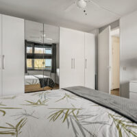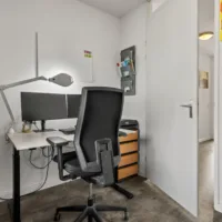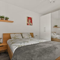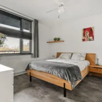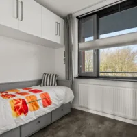 Aan de voorzijde van het appartement bevinden zich twee slaapkamers. De grote slaapkamer biedt volop ruimte voor een tweepersoonsbed, nachtkastjes en extra kastruimte, en heeft een rustig uitzicht op het groen aan de voorkant van het complex. De tweede slaapkamer is veelzijdig inzetbaar, nu in gebruik als thuiskantoor, maar even geschikt als logeerkamer of kinderkamer.