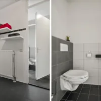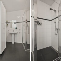 Centraal in de woning ligt de badkamer, strak betegeld in een tijdloos zwart-wit kleurenschema. De ruime inloopdouche met glazen wanden, de wastafel en de hoge kast maken er een prettige, functionele ruimte van. Naast de badkamer bevindt zich een separate WC, en er is een praktische inpandige berging met aansluitingen voor de wasmachine.