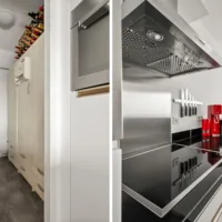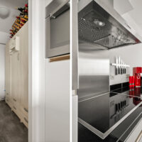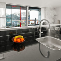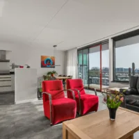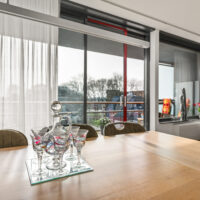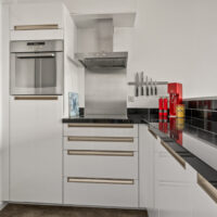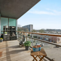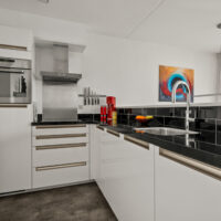 De achterzijde van het appartement staat volledig in het teken van licht en ruimte. De woonkamer, met een plafondhoogte van 2,62 meter, loopt over de volle breedte van de woning en staat in open verbinding met de keuken. De grote schuifpui nodigt uit om naar buiten te stappen, naar het brede balkon van ruim 13 m² op het zuiden, met een vrij en onbelemmerd uitzicht over de wijk. Gedurende de zomermaanden is het balkon een perfect verlengstuk van de woonkamer. De witte hoogglans keuken in L-opstelling is voorzien van een zwart granieten aanrechtblad, zwarte metrotegels als achterwand, een inductiekookplaat, inbouwoven, afzuigkap en een Quooker-kraan.