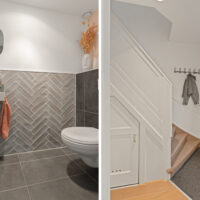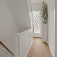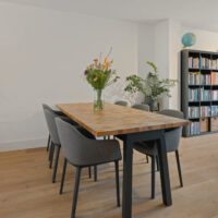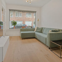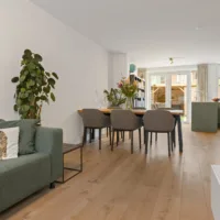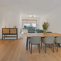 Via de entree kom je binnen in de ruime en lichte woonkamer. Grote ramen zorgen voor een prettige lichtinval en de houten vloeren geven de ruimte een warme, open en uitnodigende uitstraling. Er is volop plek voor een royale zithoek en een grote eettafel.
