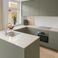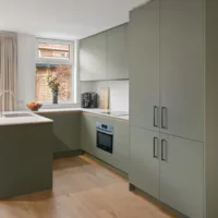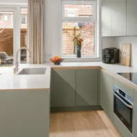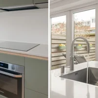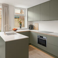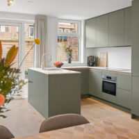 Aansluitend bevindt zich de strakke en zo goed als nieuwe keuken (2024), voorzien van diverse inbouwapparatuur, waaronder een Quooker, en voldoende kastruimte. De gehele begane grond is voorzien van comfortabele vloerverwarming. Vanuit de woning heb je direct toegang tot de zonnige tuin op het zuiden, een heerlijke plek om de hele dag van de zon te genieten.