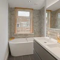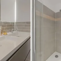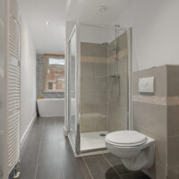 - Badkamer voorzieningen Ligbad, toilet, dubbele wastafel, wastafelmeubel, inloopdouche