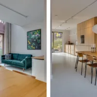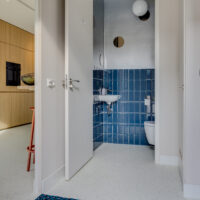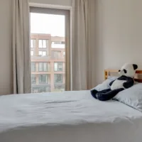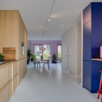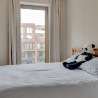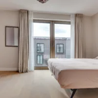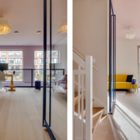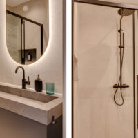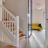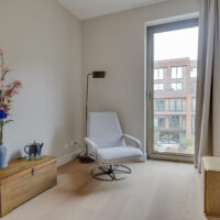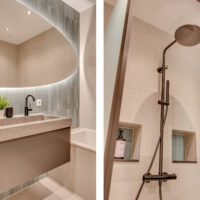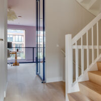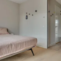 De bovenste etage biedt drie ruime slaapkamers en een tweede badkamer met ligbad. Alle kamers hebben hoge ramen en een rustige, natuurlijke uitstraling. De woning ademt licht, ruimte en moderne elegantie.