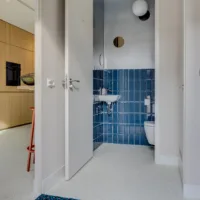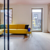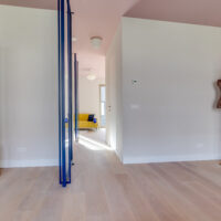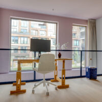 Op de eerste verdieping bevindt zich een tweede woonkamer, een ideale plek voor ontspanning. Ook is hier een werkhoek of speelruimte voor kinderen gecreëerd, met uitzicht naar buiten en zicht op de woonkamer op de begane grond. De verdieping heeft ook een moderne badkamer met inloopdouche en verfijnde afwerking.