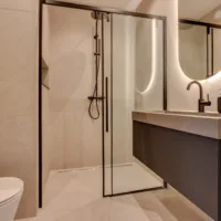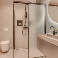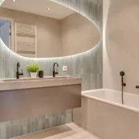 - Badkamer voorzieningen Toilet, douche, wastafel, wastafelmeubel, vloerverwarming, ligbad, toilet, wastafel, wastafelmeubel, inloopdouche, vloerverwarming