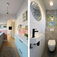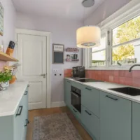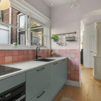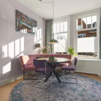 Die authentieke charme is met zorg gecombineerd met hedendaags wooncomfort. De woon-eetkamer trekt direct de aandacht: drie meter hoge plafonds, grote ramen aan de straatzijde en een warme sfeer die uitnodigt om te blijven. De sfeervolle eethoek bij het raam is de ideale plek voor een ontspannen diner. De keuken uit 2024 maakt indruk met saliegroen kasten, natuurstenen werkbladen, roze tegels als spatwand en zwarte accenten, een interieur met persoonlijkheid.