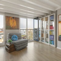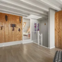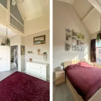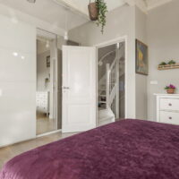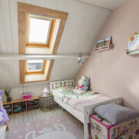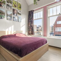 De tweede verdieping telt twee slaapkamers met zichtbare dakbalken en een dakraam, wat dit deel van de woning een eigenzinnig, intiem karakter geeft, perfect als slaap-, werk- of hobbyruimte.