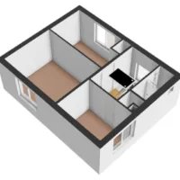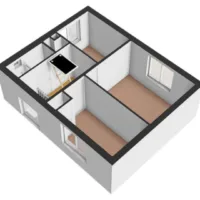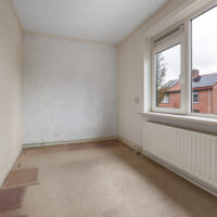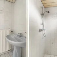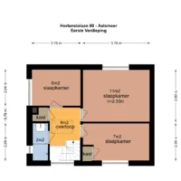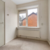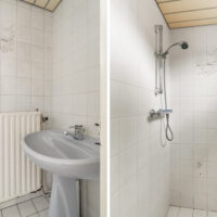 Overloop, één slaapkamer aan de voorzijde en twee slaapkamers aan de achterzijde. Badkamer met douche en wastafel.
