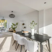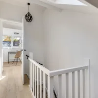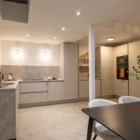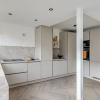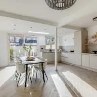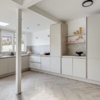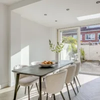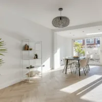 As soon as you step inside, the sense of space and light is immediately apparent. The living room at the front features large windows that fill the room with natural daylight. At the rear you’ll find the dining area, which flows into the new L-shaped kitchen.