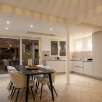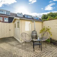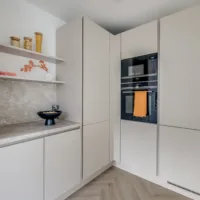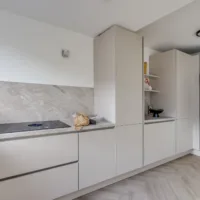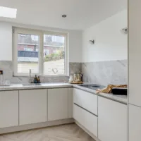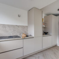 This sleek, contemporary kitchen is equipped with modern built-in appliances and a worktop with a natural stone look. From here, you step directly into the sunny garden — a peaceful spot to relax and enjoy the outdoors.