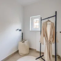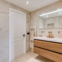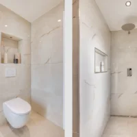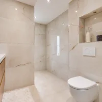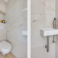 - Badkamer voorzieningen Toilet, dubbele wastafel, inloopdouche