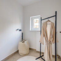 The first floor offers two spacious bedrooms, a modern bathroom with a walk-in shower, double washbasin and toilet, a separate laundry room, and a small balcony at the rear.
