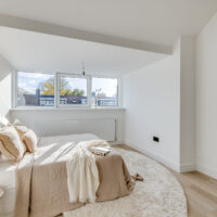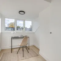 De tweede verdieping biedt een verrassende hoeveelheid ruimte met een grote slaapkamer met dakkapel, een extra kamer die zich goed leent als werkplek of kastenkamer, en handige bergruimte achter de knieschotten.