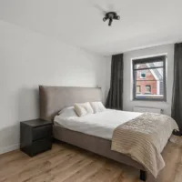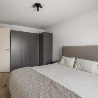 Ook de eerste verdieping is volledig afgewerkt met gladde wanden en plafonds. Hier bevinden zich drie slaapkamers en een vernieuwde badkamer met inloopdouche, wastafelmeubel en toilet, strak, fris en functioneel ingericht.