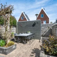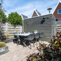 De achtertuin ligt op het noordoosten en is netjes aangelegd, met achterin een vrijstaande houten berging voorzien van elektra. Ideaal voor fietsen en extra opslag.