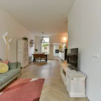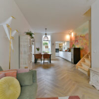 Via de lichte hal met stijlvol tegelwerk stap je de ruime woonkamer binnen. Dankzij het hoge plafond en de grote voorramen voelt deze ruimte luchtig en warm aan. De visgraatvloer geeft de begane grond een moderne basis en de indeling geeft perfect ruimte voor een royale zithoek.