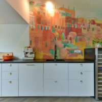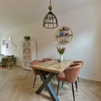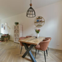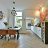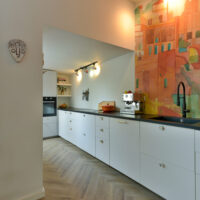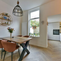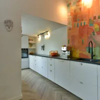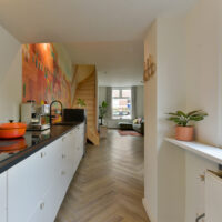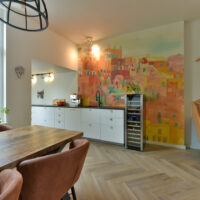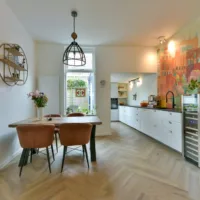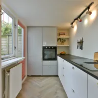 Aansluitend vind je de eetkamer en de moderne keuken. De keuken is uitgerust met een strakke witte opstelling, veel opbergruimte, koel/vriescombinatie, kookplaat met geïntegreerde afzuiging en combi-oven. De kleurrijke wandprint achter het werkblad is een echte blikvanger en geeft de ruimte karakter. Vanuit de keuken loop je zo door naar de zonnige patio: een knus en beschut buitenplekje voor een kop koffie of een borrel in de avondzon.