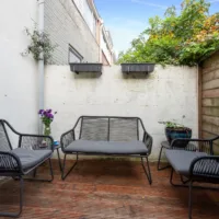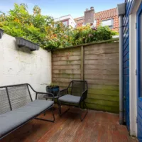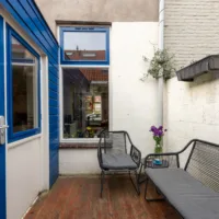 De patio is een fijne, rustige plek midden in de stad, met genoeg ruimte voor een gezellige zithoek. Dankzij de ligging tussen de omliggende gevels heb je hier veel privacy en weinig geluid van de straat.