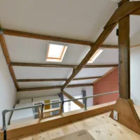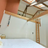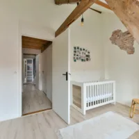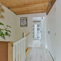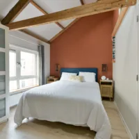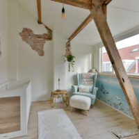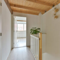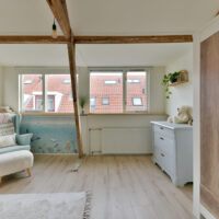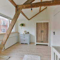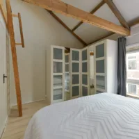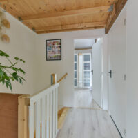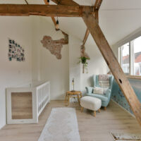 De eerste verdieping biedt twee ruime slaapkamers. Aan de achterzijde ligt een lichte kamer met brede raampartij, ideaal als kinderkamer of rustige werkplek. Aan de voorzijde bevindt zich de royale master bedroom met hoge nok, prachtige houten balken en volop ruimte voor een grote kast.
