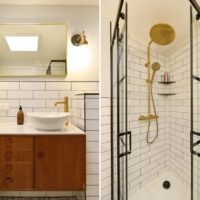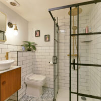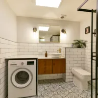 De badkamer is luxe afgewerkt met matzwarte details, een breed wastafelmeubel, toilet, wasmachine-opstelling en een ruime inloopdouche met dubbele douchekoppen en industriële glazen wand. De combinatie van wit, hout en patroontegels zorgt voor een frisse en warme sfeer.