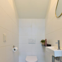 Op de begane grond bevindt zich ook een modern toilet in frisse zwart-wit uitvoering.