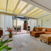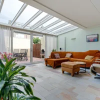 • Serre-aanbouw met veel glas voor extra lichtinval met zonneschermen