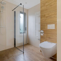 - Badkamer voorzieningen Toilet, douche, dubbele wastafel, wastafelmeubel