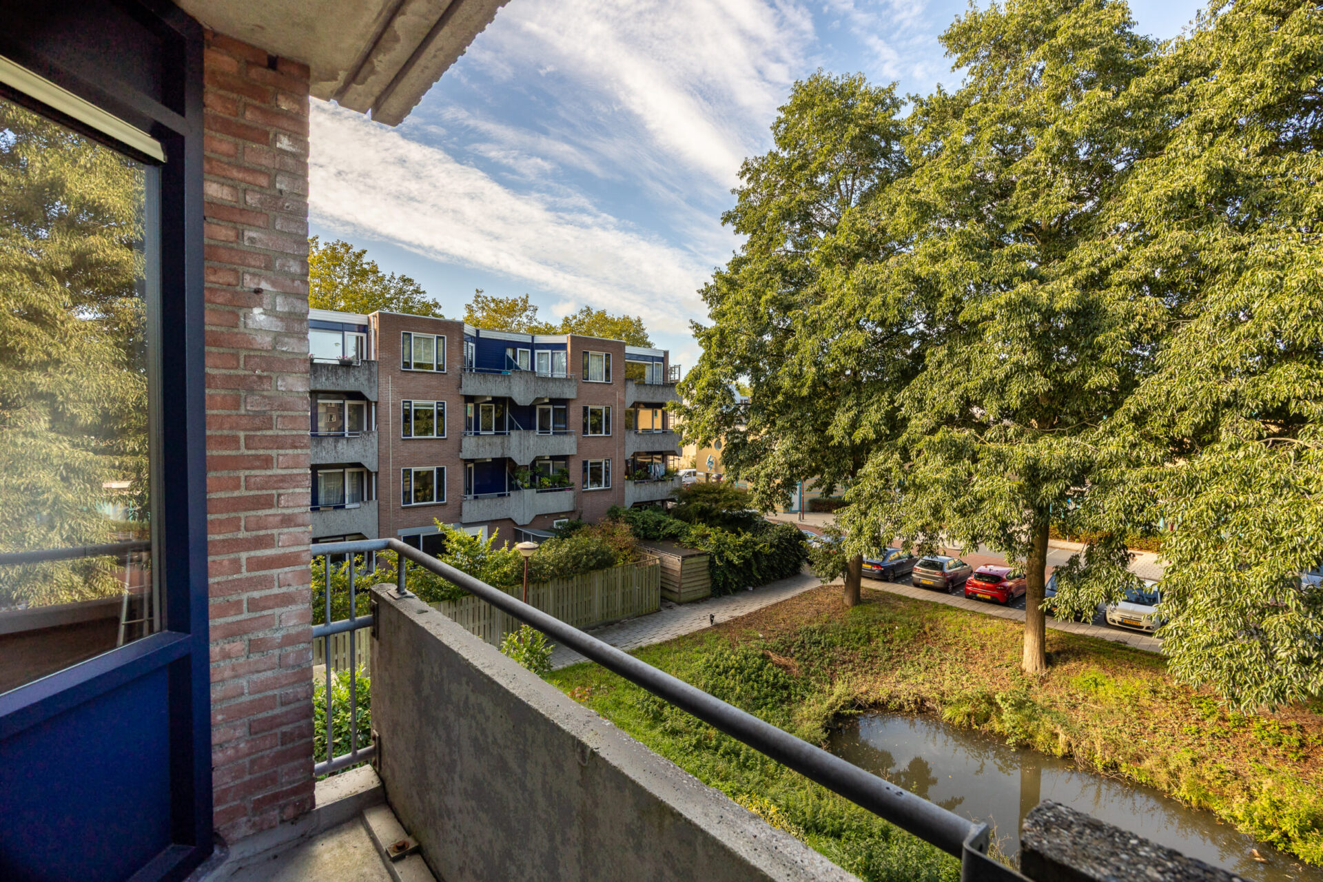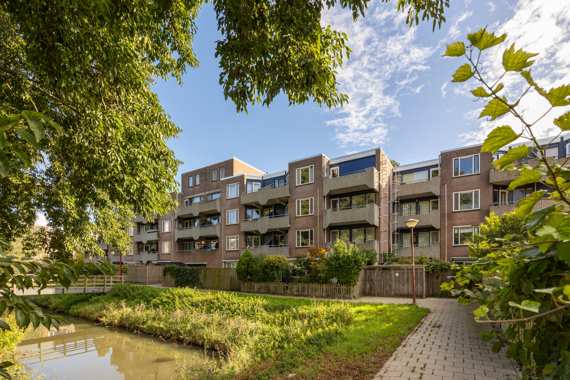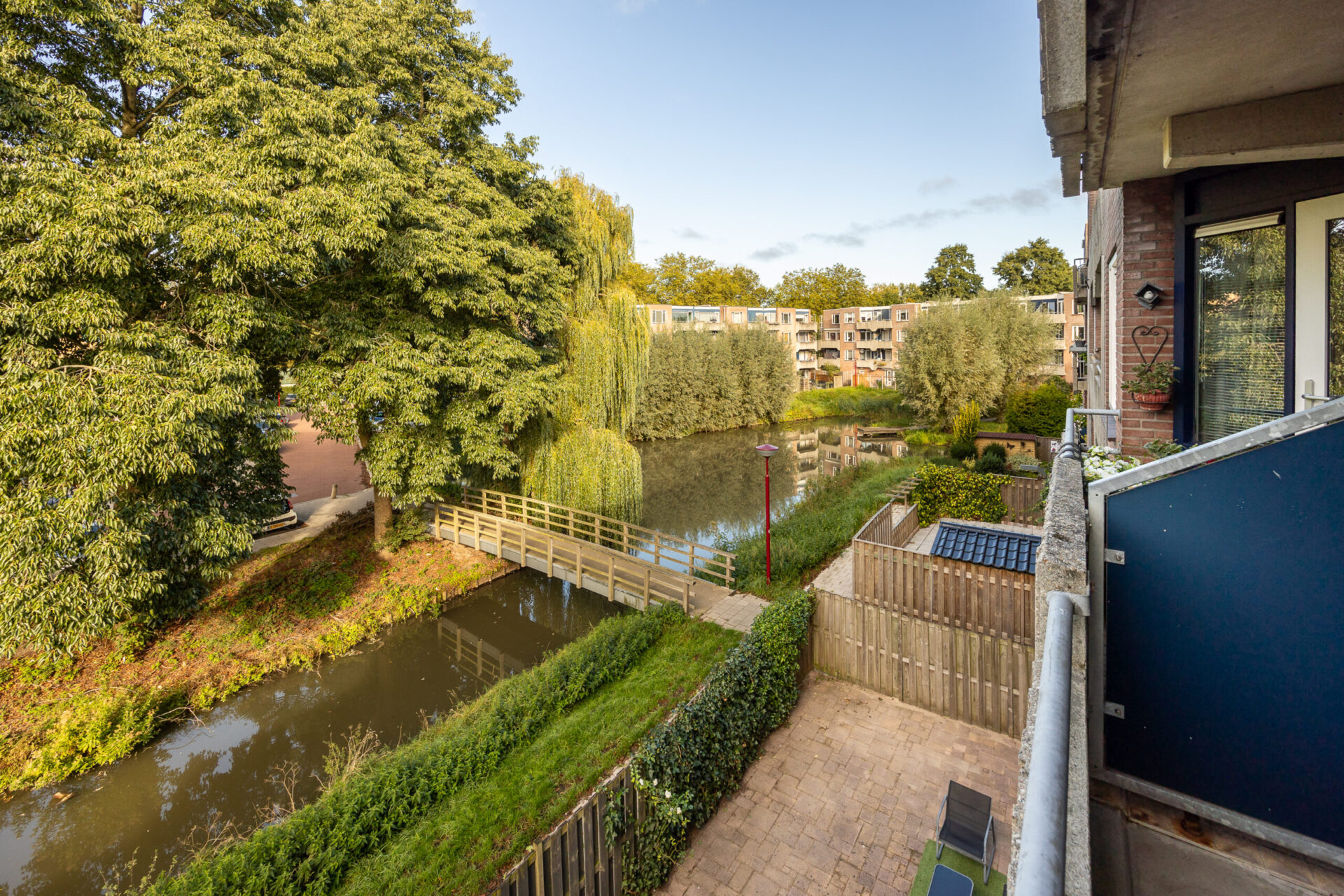 Uniek aan dit appartement zijn de drie balkons, gelegen op verschillende hoeken van de woning. Hierdoor kunt u de hele dag door van de zon of juist de schaduw genieten. Het uitzicht over het groen en het water met het bruggetje maakt het uitzicht compleet.