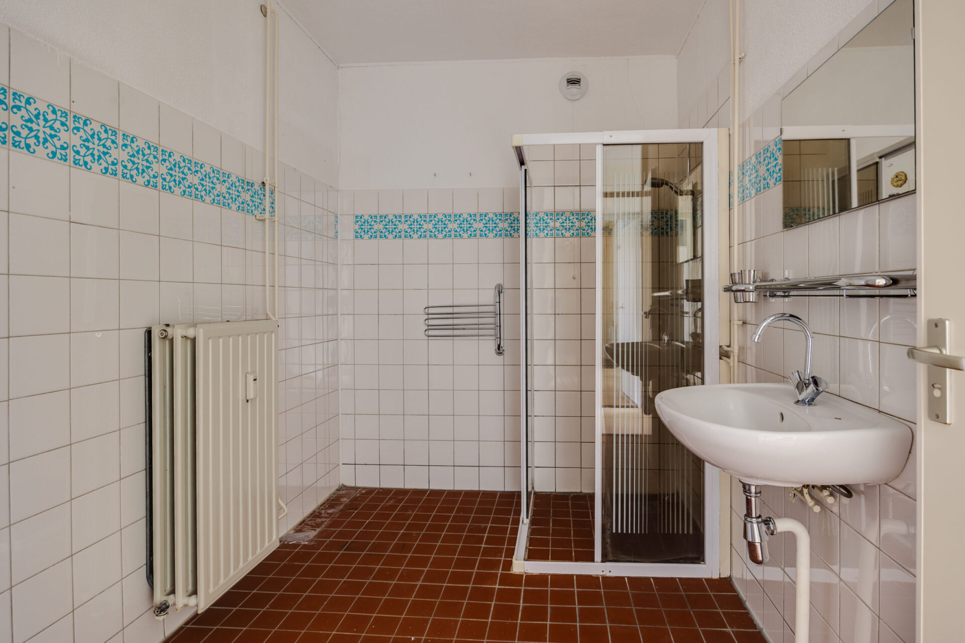 • Badkamer: De badkamer is praktisch ingedeeld met een douche, wastafel en radiator.