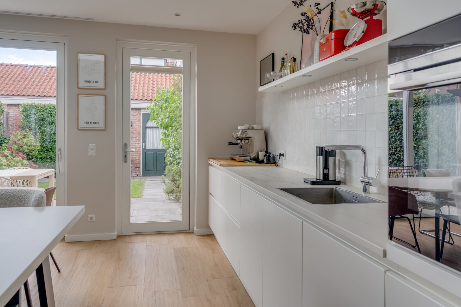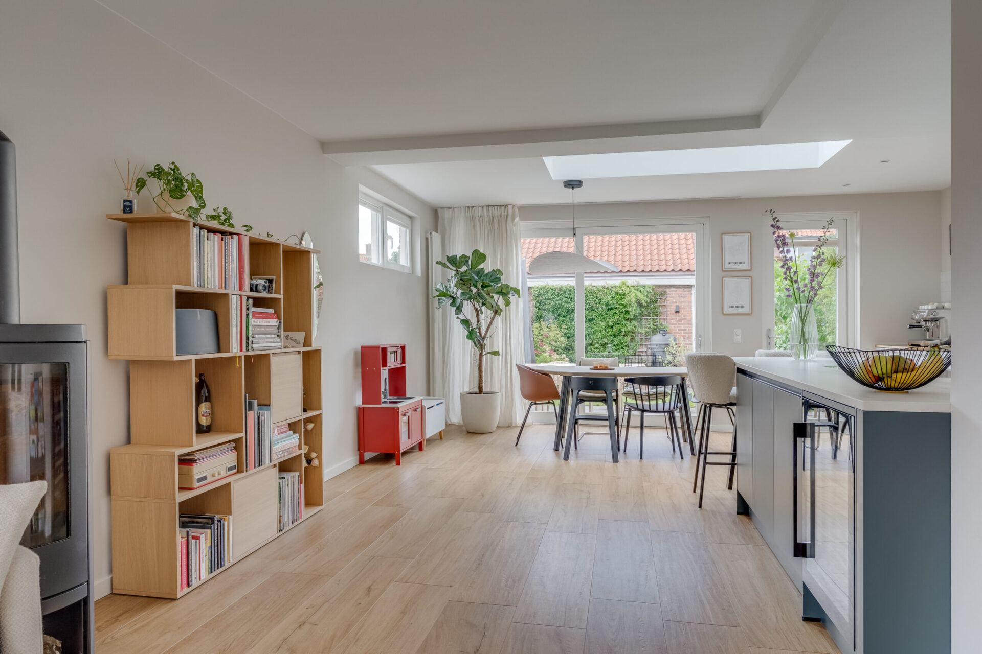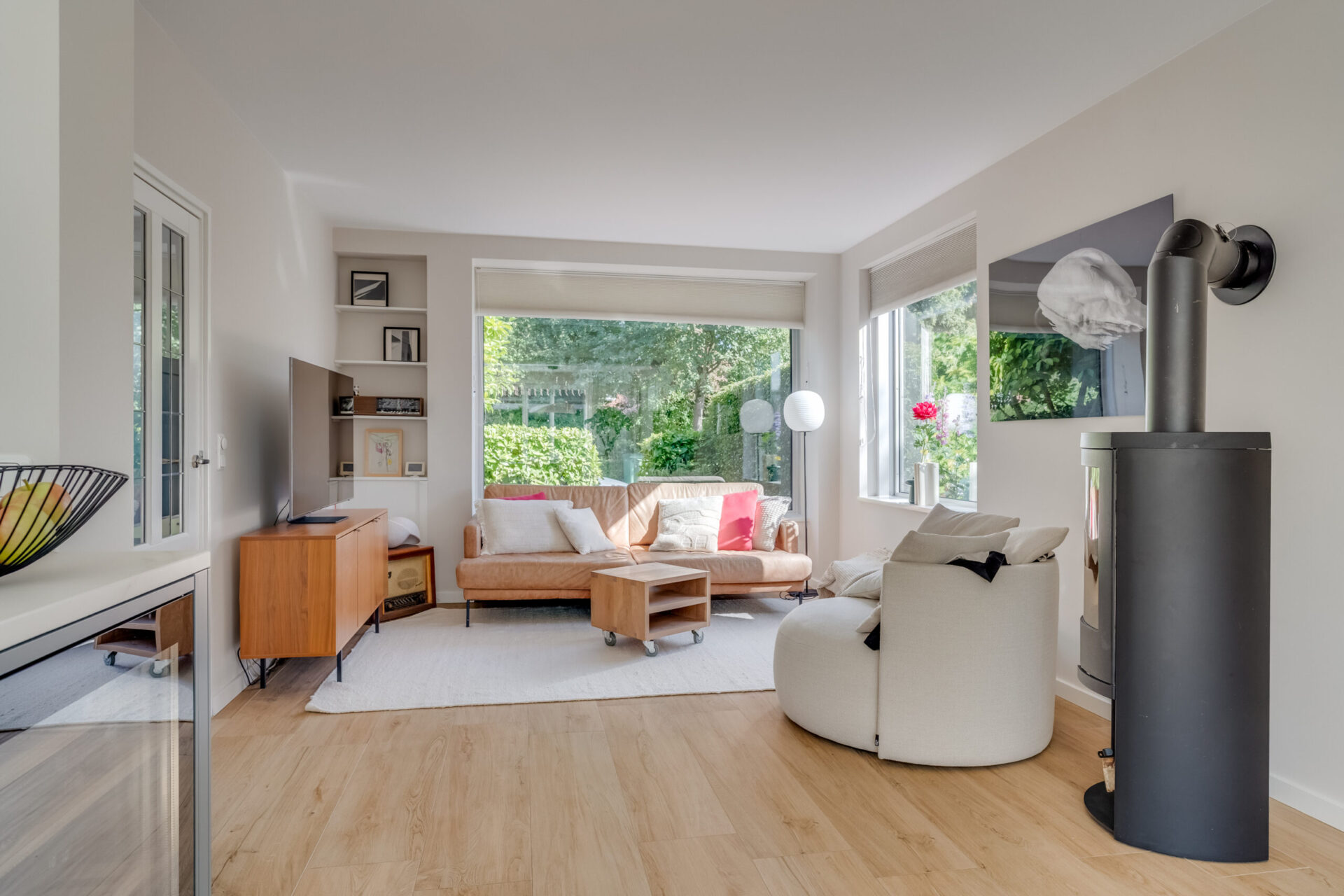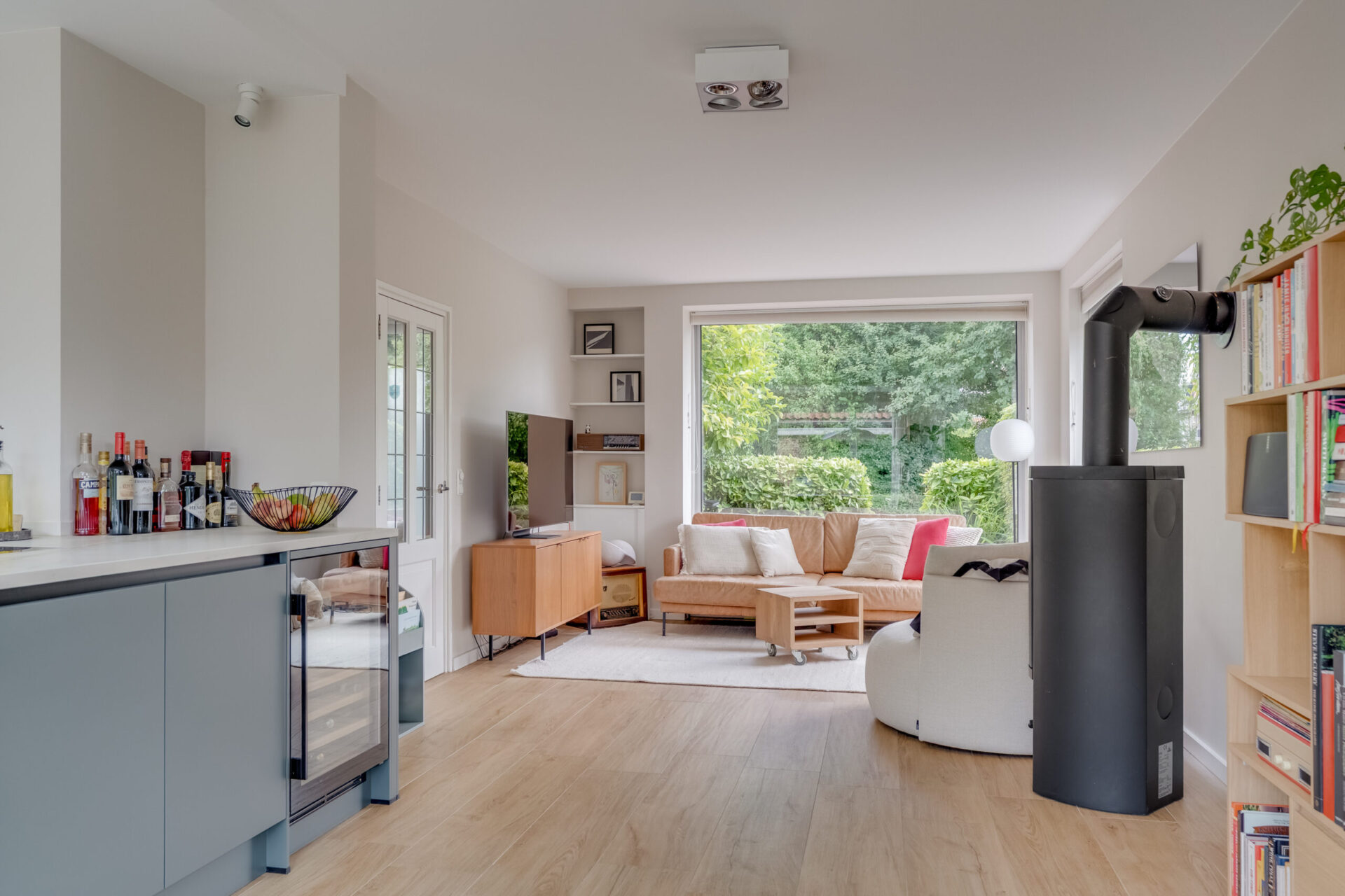 De royale voortuin leidt naar de entree met vernieuwd toilet, meterkast, trapkast en trapopgang. De uitgebouwde woonkamer (maar liefst 3 meter extra) is heerlijk licht dankzij de grote schuifpui, extra zijramen en een daklicht. Een sfeervolle houtkachel en vloerverwarming zorgen voor extra comfort.